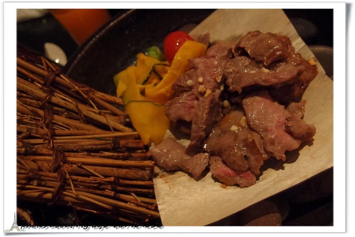 牛肉箬竹燒~沙朗牛肉浸泡主廚私房醬汁24hrs後,先煎後烤至7分熟,石板加熱下箬竹散發竹香~