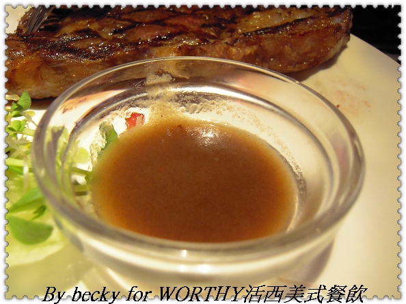 沙朗也通稱牛助,這是外國人的說法~老闆有說通常先煎好牛肉後,要先冷卻幾分鐘,這樣子才可以把牛肉的原汁保留在肉中,朋友是吃7分熟度,但還是看的到牛肉的鮮嫰度及滿滿的肉汁,店家獨家特級紅酒醬,將肉的鮮甜及醬汁合二為一入口,朋友說很不錯。