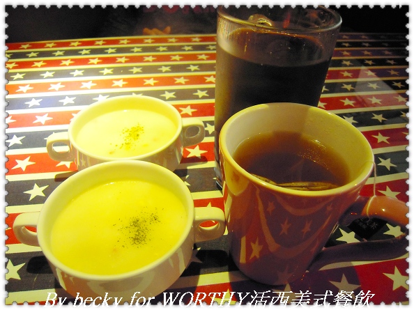 我點的是黑覺醒(熱),朋友點的是可樂~就一般的無糖的茶,並無特別之處;濃湯則是玉米濃湯,味道濃稠,有玉米、馬鈴薯及碎的火腿,天氣冷喝上一杯,還蠻溫暖的。