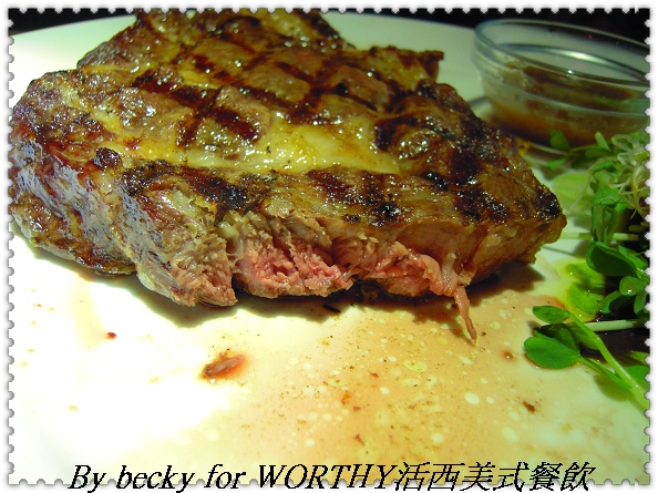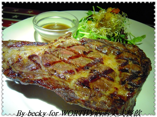 美國16OZ沙朗牛排:老闆是選用美國安格斯choice等級沙朗,透過完美厚度與3-5分熟的饕客吃法,新鮮肉塊不做任何的醃漬,將牛肉最原始鮮甜與嚼勁完美呈現給客人,所以看的出牛排的厚度。