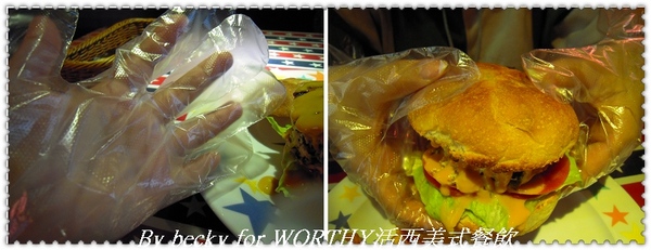 店家還附上手套,讓我們這種饕客不會吃的滿手都是~老闆還分享外國人吃漢堡不會掉的滿桌都是吃法:先看看麵包上下那一邊厚實,最厚的一邊為下,而後從上往下壓扁,然後再把上下顛倒反過來大口的吃,所以外國人吃漢堡不會掉食材,改天再來試試這種吃法。(千萬不要問我:為什麼不當場試試,因為老闆在我吃到一半時才來閒哈啦,根本沒機會可以嚐試!)