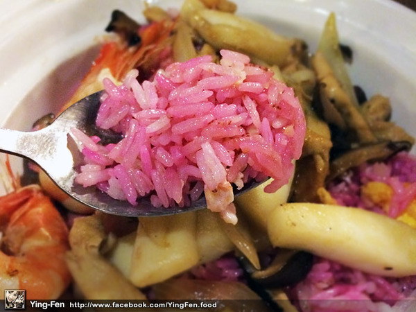 上面一些海鮮和菇類,底下是紫色的飯,看起來好特別。