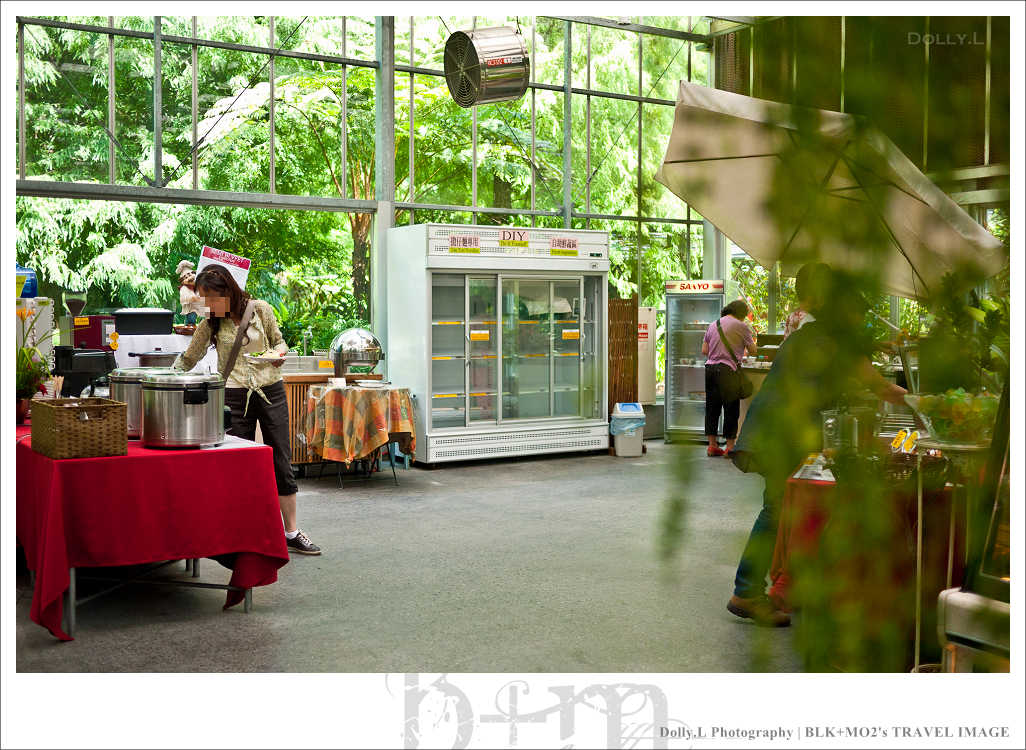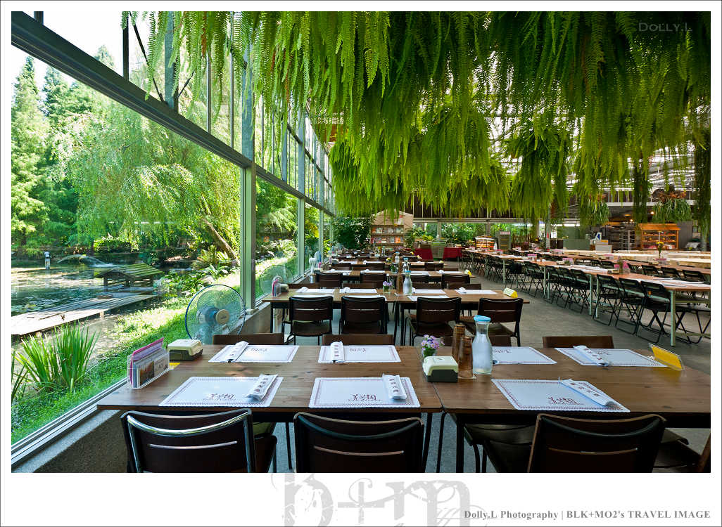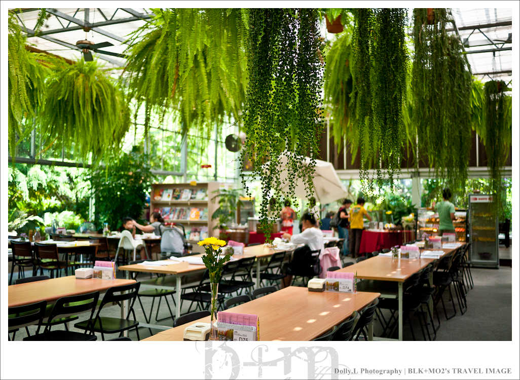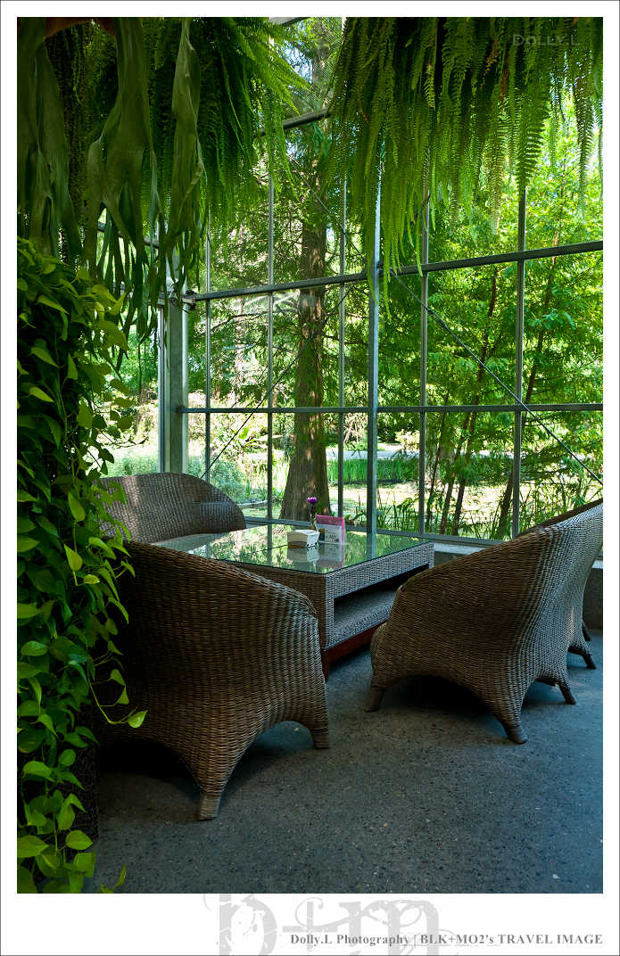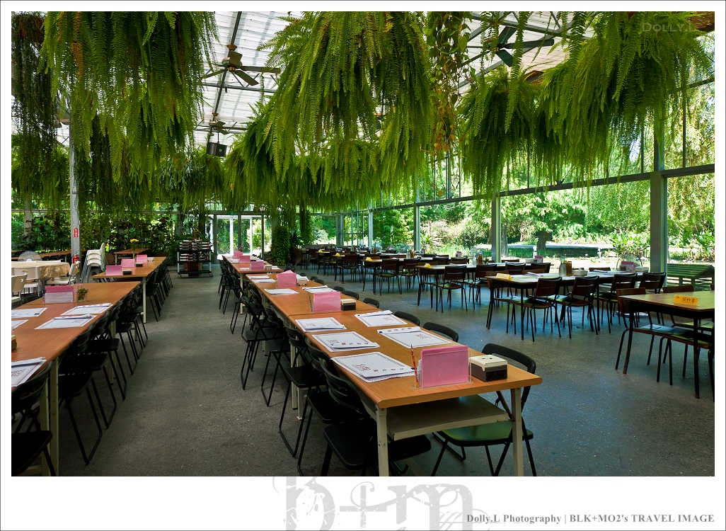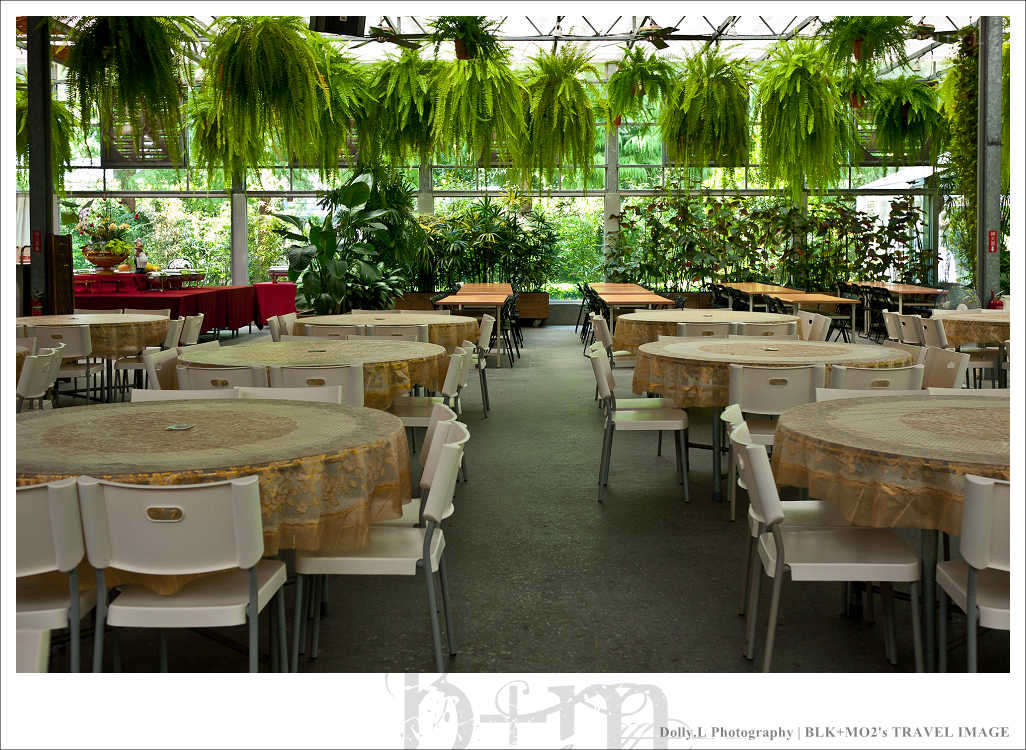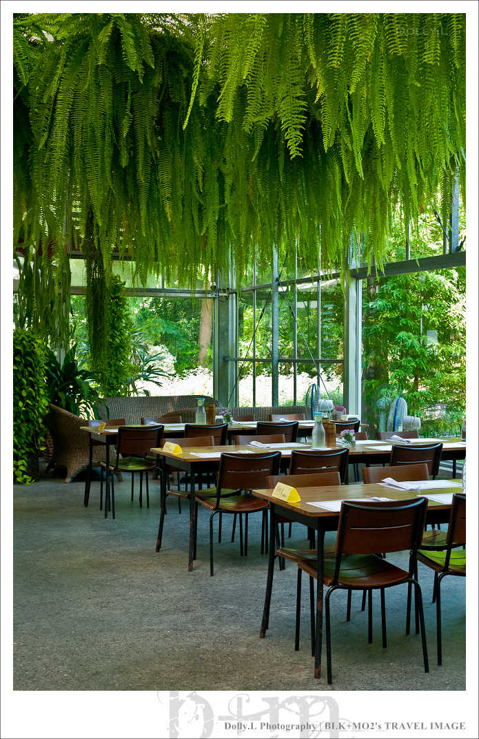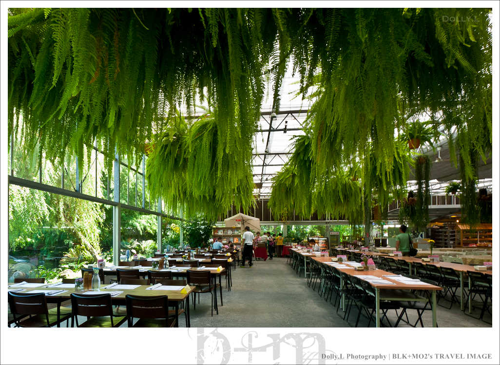 這座超大型的溫室餐廳四周以玻璃築起,挑高的空間設計視覺上相當的舒適寬廣!而且還利用水冷原理的設計達到降低室內溫度效果,非常有環保概念。天花板掛上許多蕨類植物讓室內就像是個花房般,真的好美!
