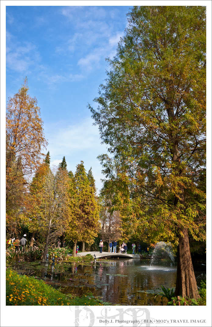整個園區最吸睛的是種植在水中的落羽松群,樹形很美的落羽松在夏天時是生意盎然的綠,接著隨季節轉黃變紅,因此「菁芳園」的冬季特別的美!!真的就像是明信片般的美景,「菁芳園」完全善用自己的園藝優勢打造這麼優美的花園。