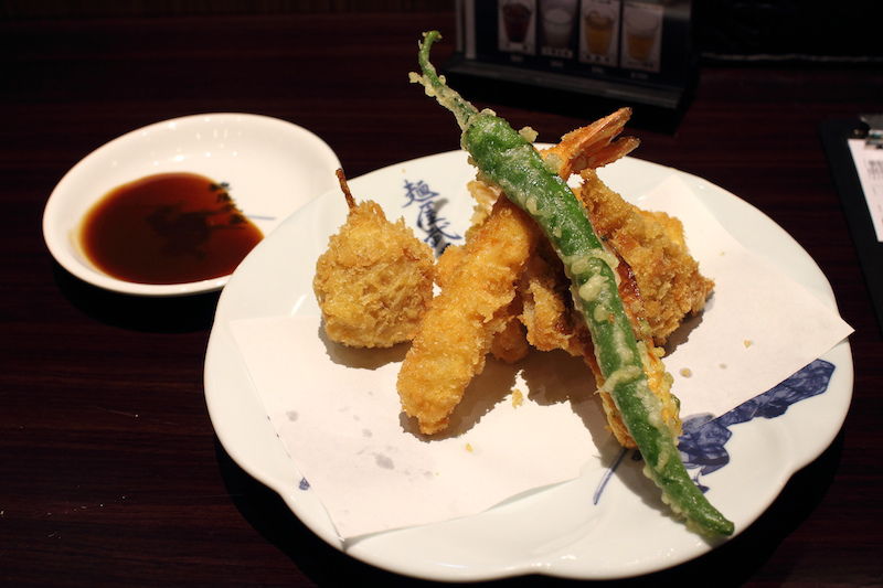 麵屋武藏的一般拉麵價位倒還好,但掛上限定的拉麵就不便宜了,雖然不需服務費,但一份也要380。二天限定的拉麵有兩款,都是搭配炸物,我選的是二天一流,搭配炸蝦、培根番茄、雞肉、里肌肉、竹輪與青辣椒等炸物。炸物與拉麵不是同時送上,炸物先而拉麵後,如果要一起吃的話,恐怕等的炸物都冷了。炸物搭配的是酸甜的醬汁,頗有解膩效果,麵衣酥脆不油膩,不過冷了稍有點硬,容易刮口。炸物的表現倒沒太大令人驚艷之處,就是不差而已。