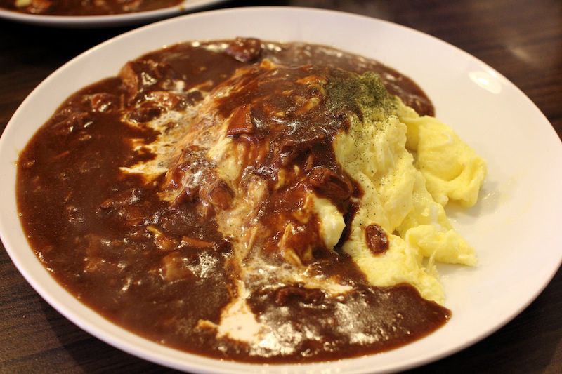 以前看料理東西軍時,最最想吃的就是蛋包飯,那種蛋包飯與台灣用蛋皮把飯包起的蛋包飯不同,而是用平底鍋煎出橢圓形的蛋捲,放在飯上,用刀切開,蛋包往兩旁攤開,露出裡頭半熟滑嫩的雞蛋,接著淋上咖哩或是紅酒醬,實在是太誘人了。可是接連去了幾次日本,都不曾找到這樣的蛋包飯,最多也就在箱根的一家餐廳吃到半熟炒蛋的蛋包飯。雖然沒有電視上那種半熟蛋包來的動人,可也很不錯了,至少比台灣的蛋皮包飯好吃太多。