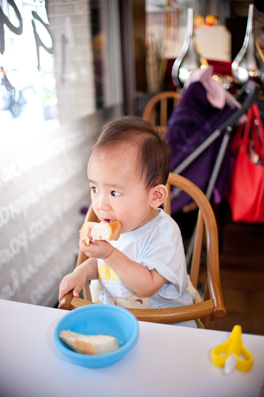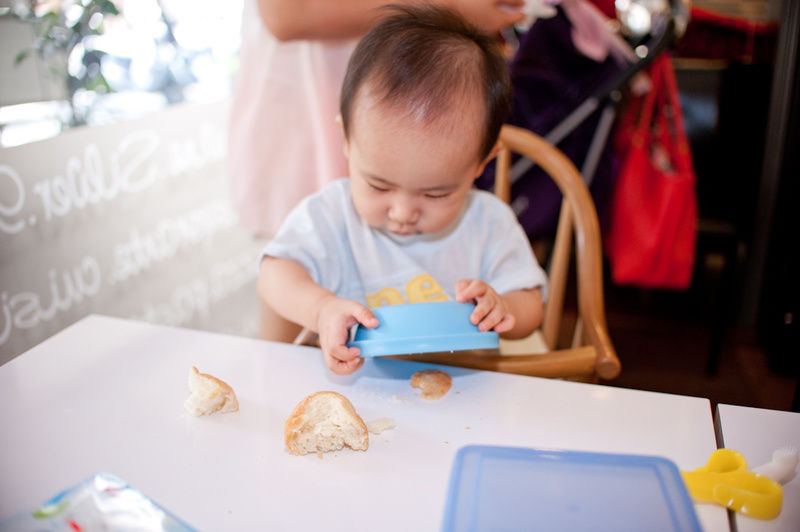 過沒多久就開始把玩盤子了 ! 也打翻了麵包 ><"