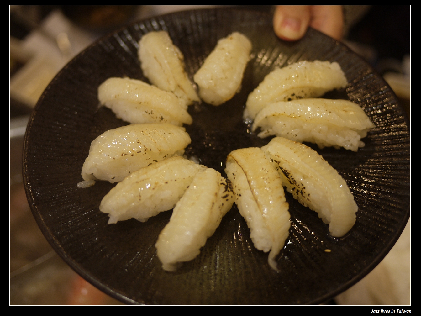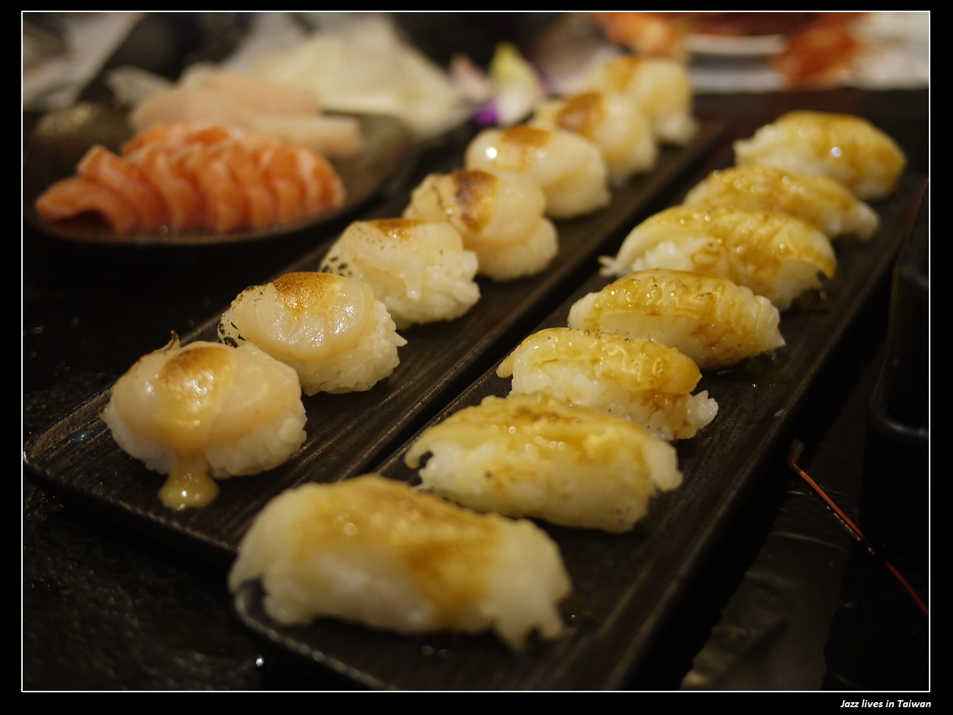 炙燒干貝握壽司上塗的是味噌醬, 其實與炙燒干貝味道有衝突, 如果不要塗醬, 干貝的甜味會比較明顯,