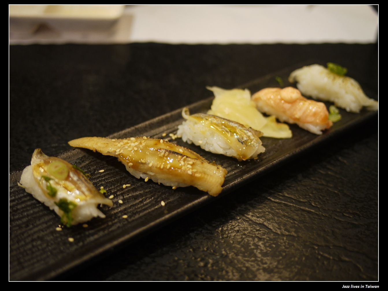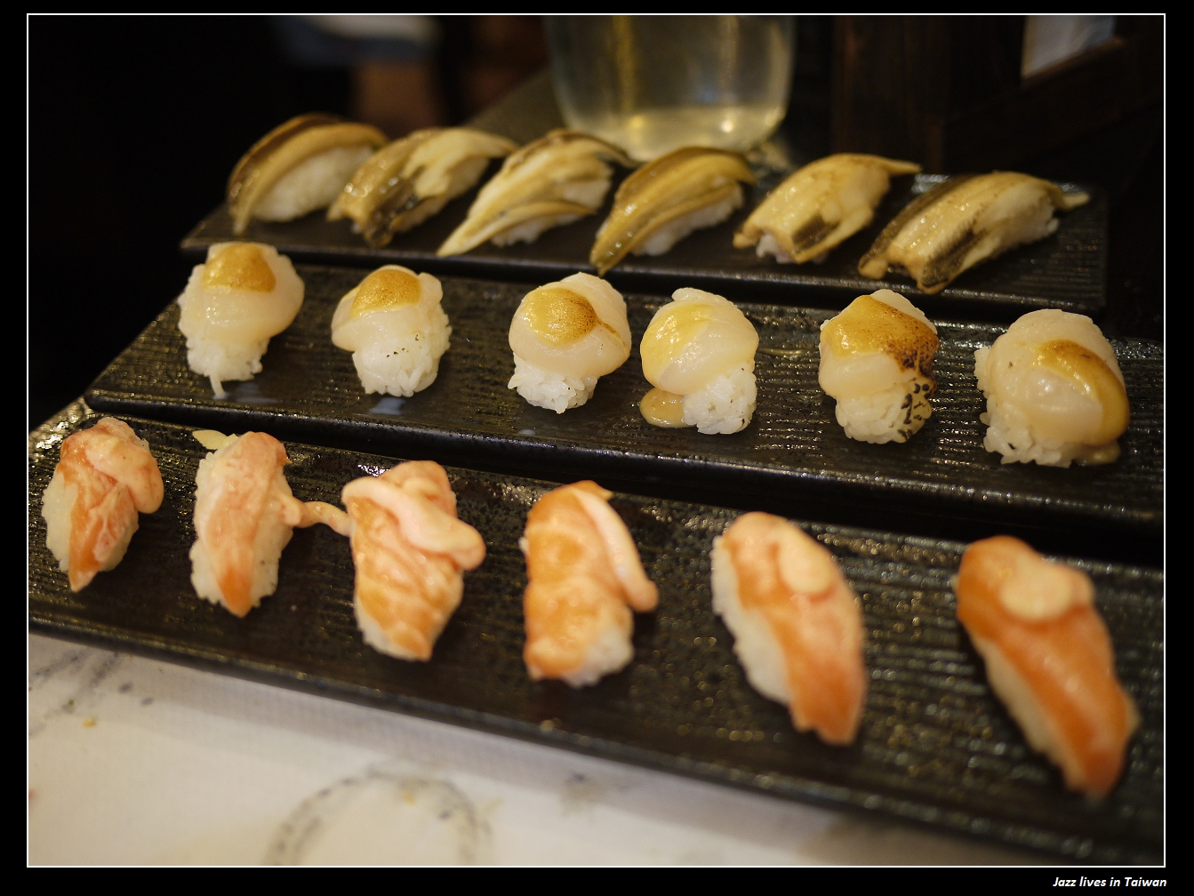 加點的炙燒干貝握壽司, 炙燒比目魚鰭邊肉握壽司, 還一個店家莫名其妙送上的炙燒握壽司(看起來像是鯖魚握壽司),