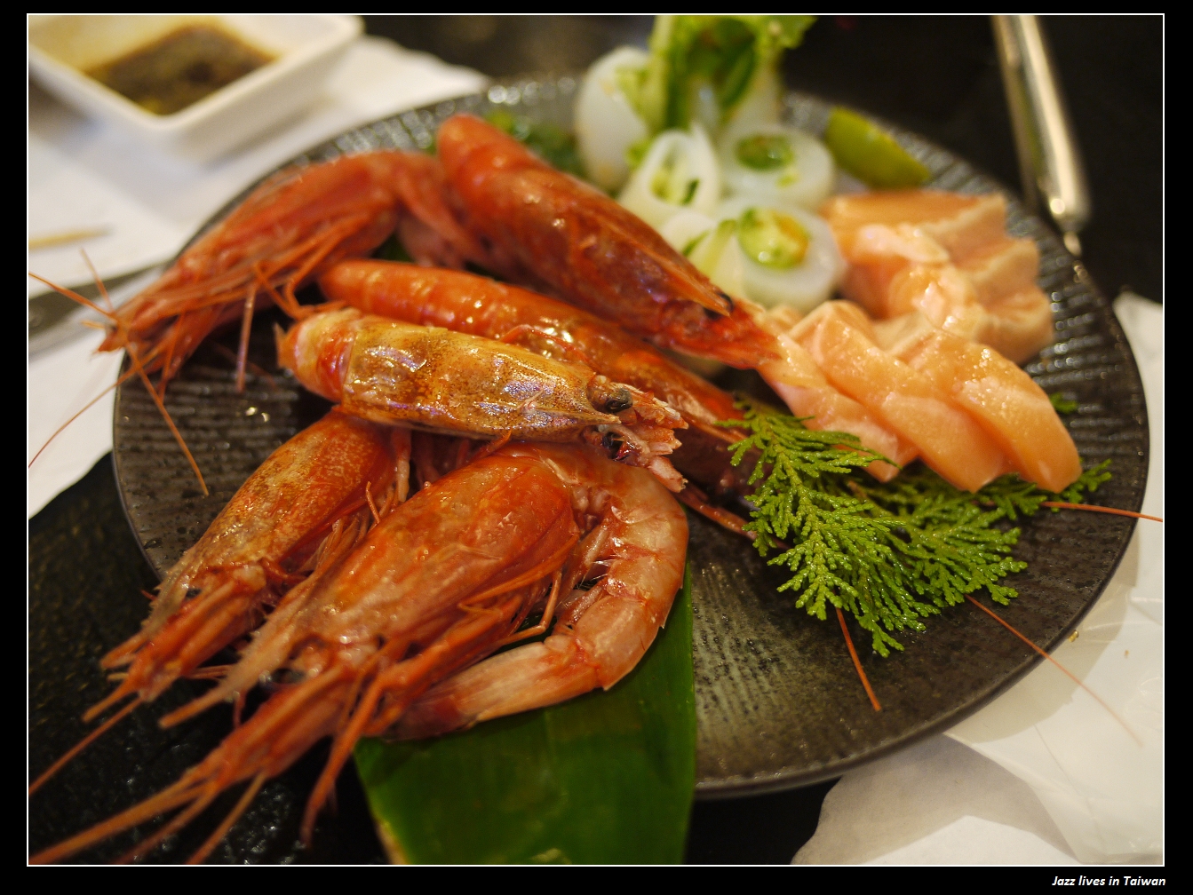 店家一開始送上的綜合生魚片, 有要自己剝殼的甜蝦, 蝦卵花枝(或是軟絲), 紅魽, 海鱺, 鮭魚,