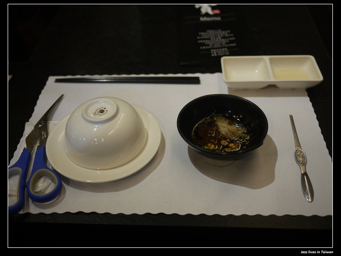 餐桌上放擺放了吃螃蟹的剪刀與挖肉的器具, 還有火鍋沾醬, 吃螃蟹專用的醋沾醬, 還有可以沾握壽司, 生魚片的醬油與芥末沾醬,
