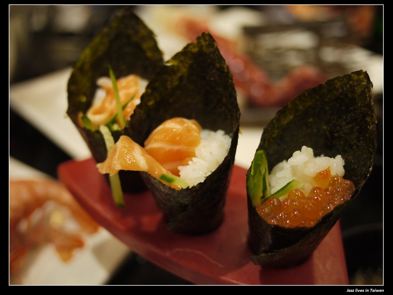 蔥花鮭魚手捲(其實沒有蔥花只有小黃瓜), 龍蝦沙拉手捲, 鮭魚卵手捲,