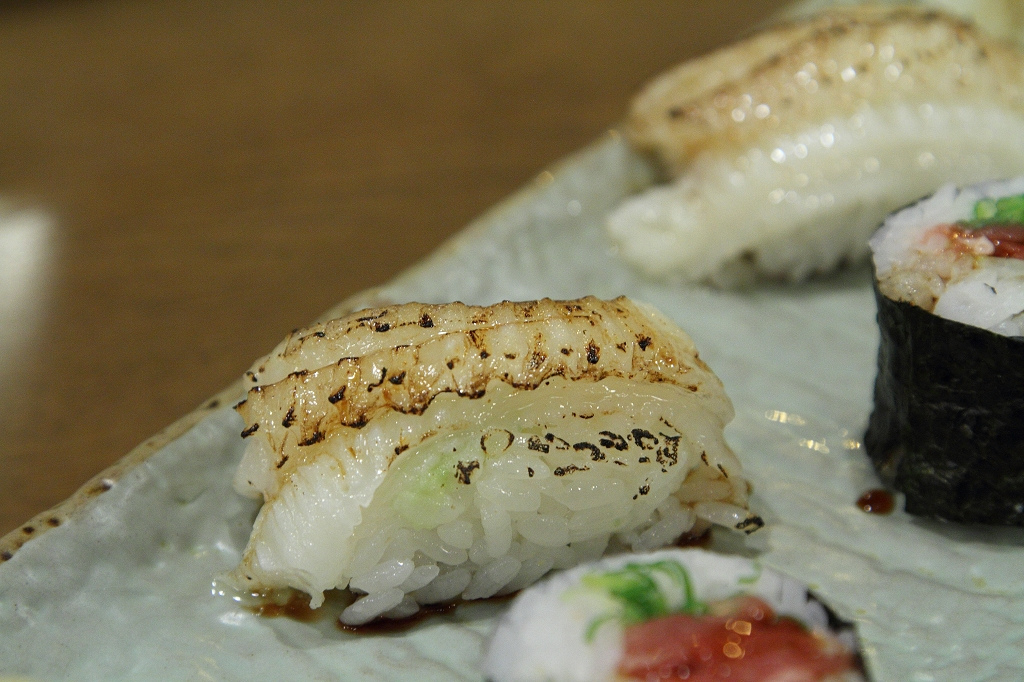 握壽司,比目魚鰭邊肉,外表利用炙燒烤出香味,入口瞬間像脂肪般化開的口感,瞬間香氣充斥口中,是平常食材很少吃到的特殊的食感。