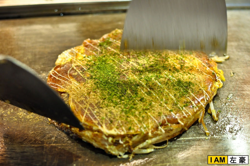店家先把麵糊倒於鐵板畫成圓形狀,再將豬肉片