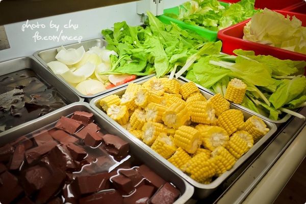 都是比較傳統一點的餐廳才看的見這種鐵盤,然後全都是基本配料,但我不吃火鍋料的啊!!!