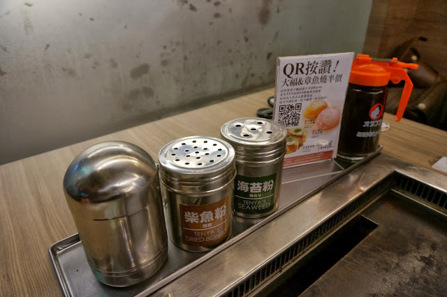 ▲所以在等候鐵板加熱的過程中也當然先來了解熟悉等一下一同使用到的美味好伙伴們,這邊檯面上依序擺放了,沙拉油(供鐵板使用)、柴魚粉、海苔粉、、好吃燒醬料,可供搭配料理使用。