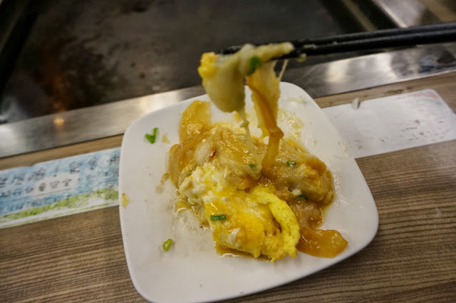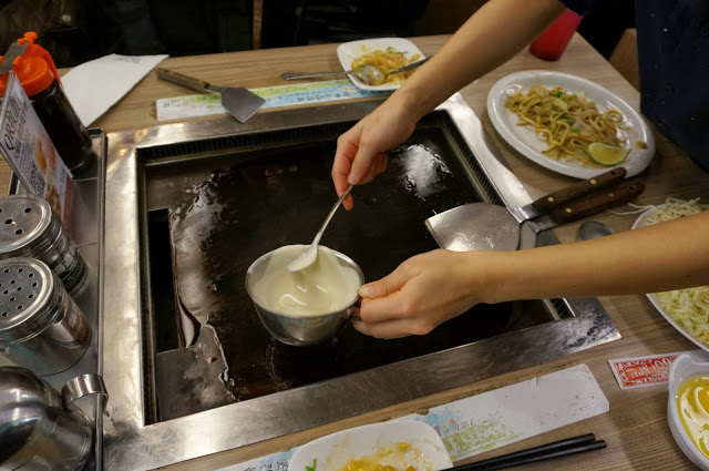 ▲這邊就將特製的麵皮攪拌後,倒入鐵板上。麵皮有特製的比較例,麵皮總還是要調製搭配,不然麵皮的口感與形成的外皮總會不太對勁