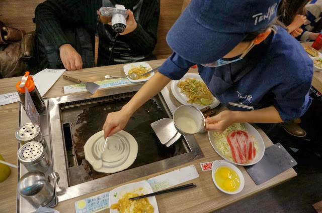 ▲超利害的完成麵皮的成型,再覆蓋到麵條上將二者合為一體組合~~可愛的服務人員說有時會因為鐵板溫度或其他因素造成麵皮無法完美成型,就會將麵皮捨棄再重新製作一次,對於這樣完美的要求真是值得鼓勵,麵皮兒們也請加油呀!!