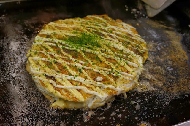 ▲最後就呈現美美的廣島燒啦~(≧∀≦),而親切的服務人員說有五種美乃滋(原味、辣味、蒜味、黃芥末、綠芥末)可任選兩種做搭配的醬料,就請她推薦搭配的部份選擇了原味、黃芥交錯的在黃金酥脆的廣島燒上格紋式的呈現了。