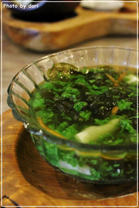 翠綠色的蔬菜湯內包含了綠藻、雨來菇、嫩豆腐,雨來菇要等下雨過後才能看到,通常在石塊上採集,也因得來不易,象徵著天使的眼淚。