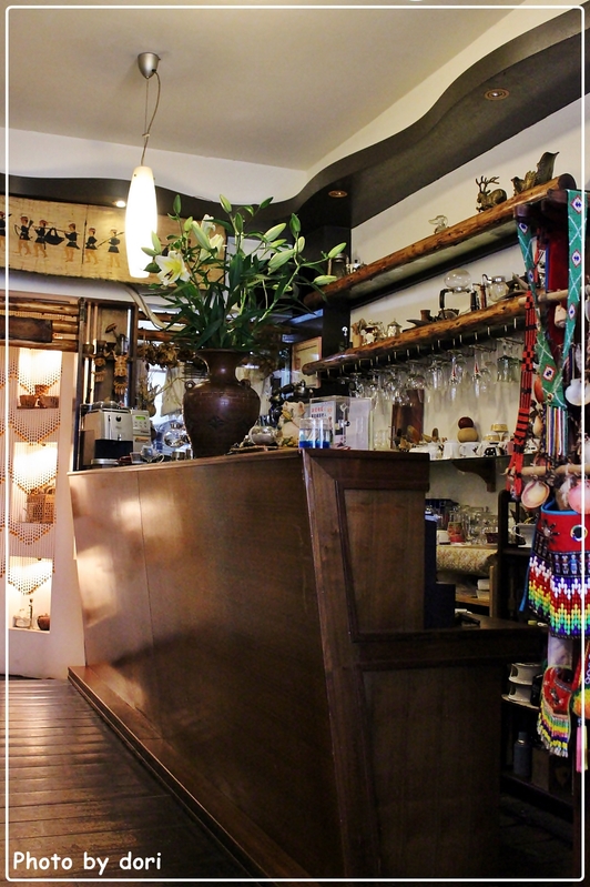 店內裝潢採家庭式鄉村風,但又不失原住民的文物色彩,吧檯旁吊掛著許多衣著配件的包包與飾品,前頭還插入了大把的百合花,讓人感覺很雅緻又舒適。