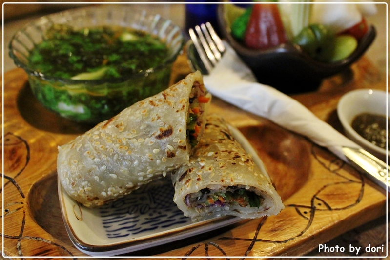 我想會取名“九味”應該指的是有九種蔬菜(當然並沒有細數),看著裡面五顏六色的蔬菜,只想一口趕緊吃下。手卷嚐起來倒有些像似潤餅的感覺,包覆的芝麻麵皮具備了彈性與韌性,也有些厚度,讓飽足感提升。