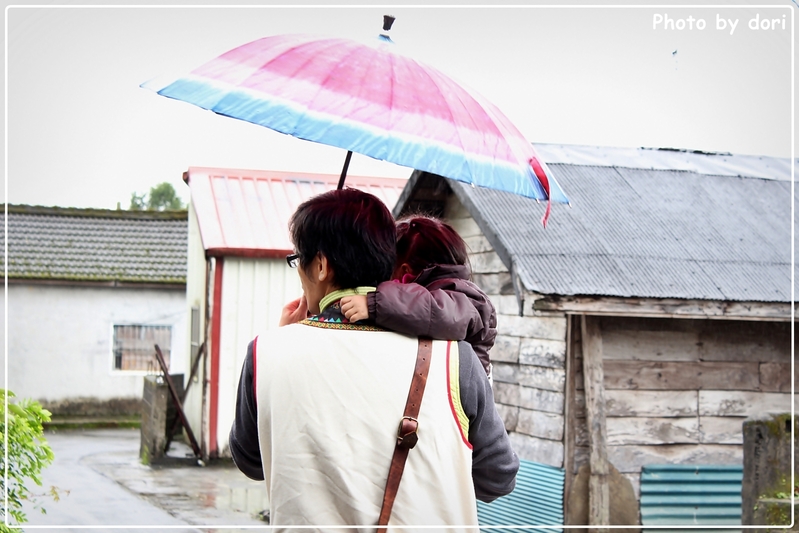 離開紅葉村時,父親抱著女兒的身影。(這把彩虹傘也太醒目了)