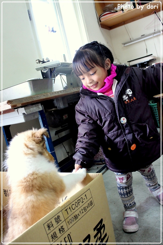 可愛的央央在大紙箱裡探出頭和手,她過去與牠握手。