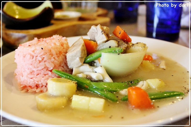 主餐的顏色看起來好粉嫩,一附很春天的樣子,可是肉塊的顏色為什麼是白白的?一口吃下之後驚覺這分明就是豬肉啊!跟我說牛肉的朋友請出來自首~(還我牛肉啦)