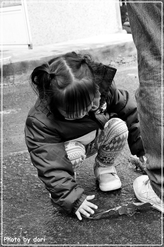 在紅葉村巫老師工作室的外頭,蹲在地上撿葉子。
