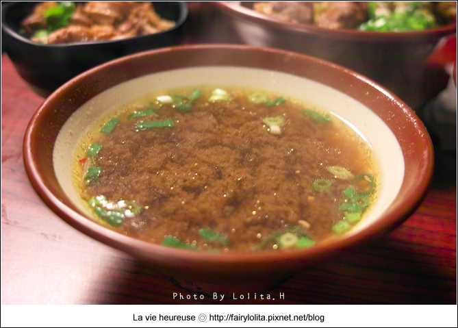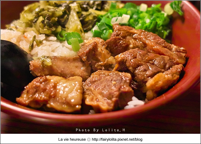 客人可依喜好選擇肋條或牛鍵,一旁搭了青蔥、酸菜,我很喜歡白飯混著青蔥一塊吃的滋味,氣味足,而且好香好香呦!入口咀嚼,滿嘴洋溢了滿滿的香氣,連我這不怎麼愛吃飯食的人,都因有了蔥花兒的加持而多嗑了幾口飯:)