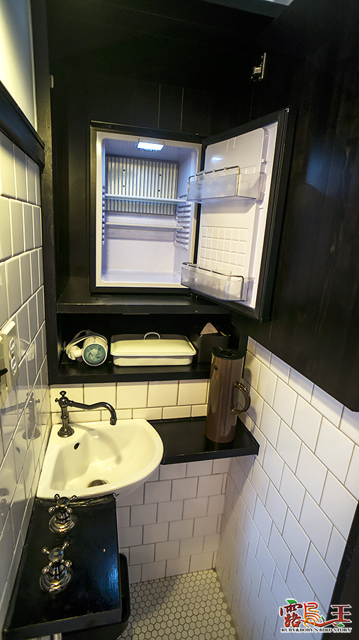 盥洗用具旁邊則是冰箱。