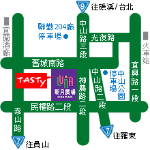 位處宜蘭最大的百貨公司新月廣場4F,火車站前步行約5~8分鐘,舊城南路與中山路口可達,5M挑高空間,繽紛具現代感用餐空間設計,