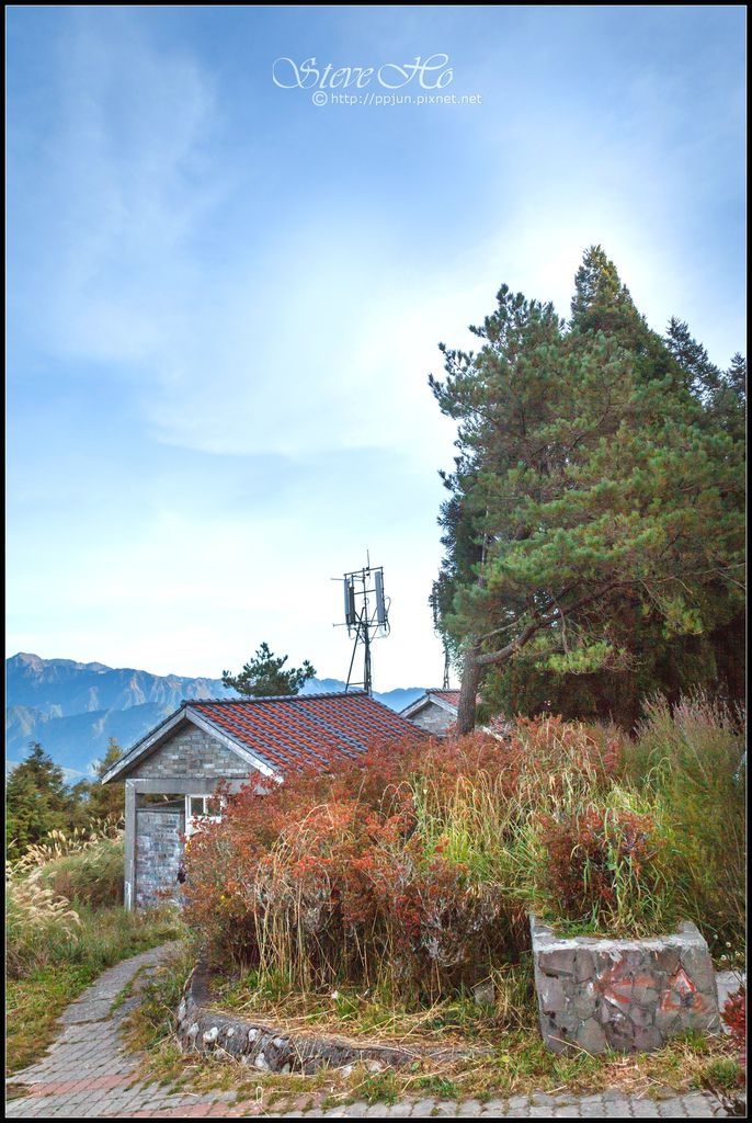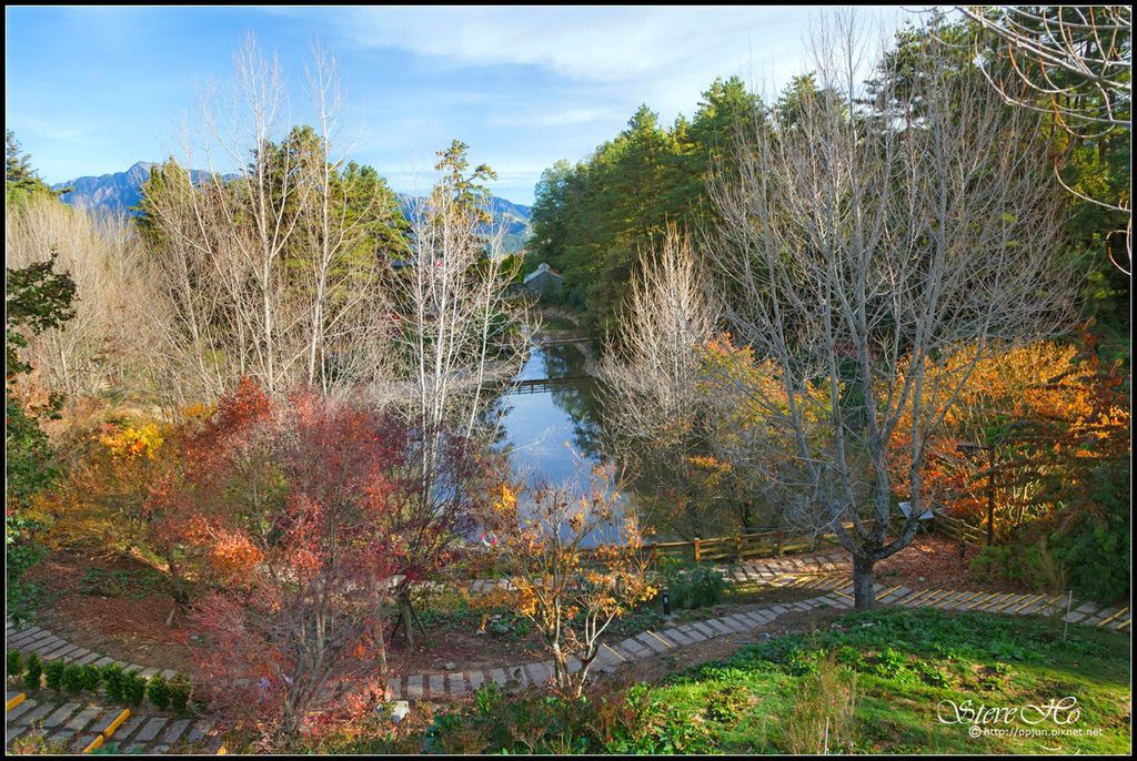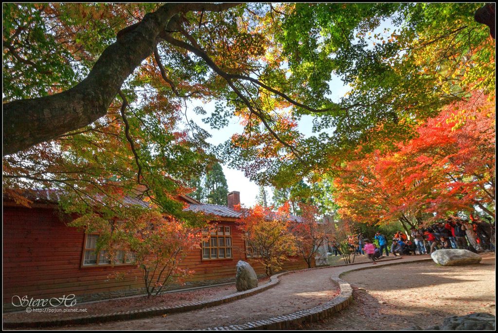 ▼ 秋意濃,松廬前的楓樹隨著高山氣候的急遽變化,褪去它綠色的T恤,換上金黃色轉深紅的絢麗晚禮服