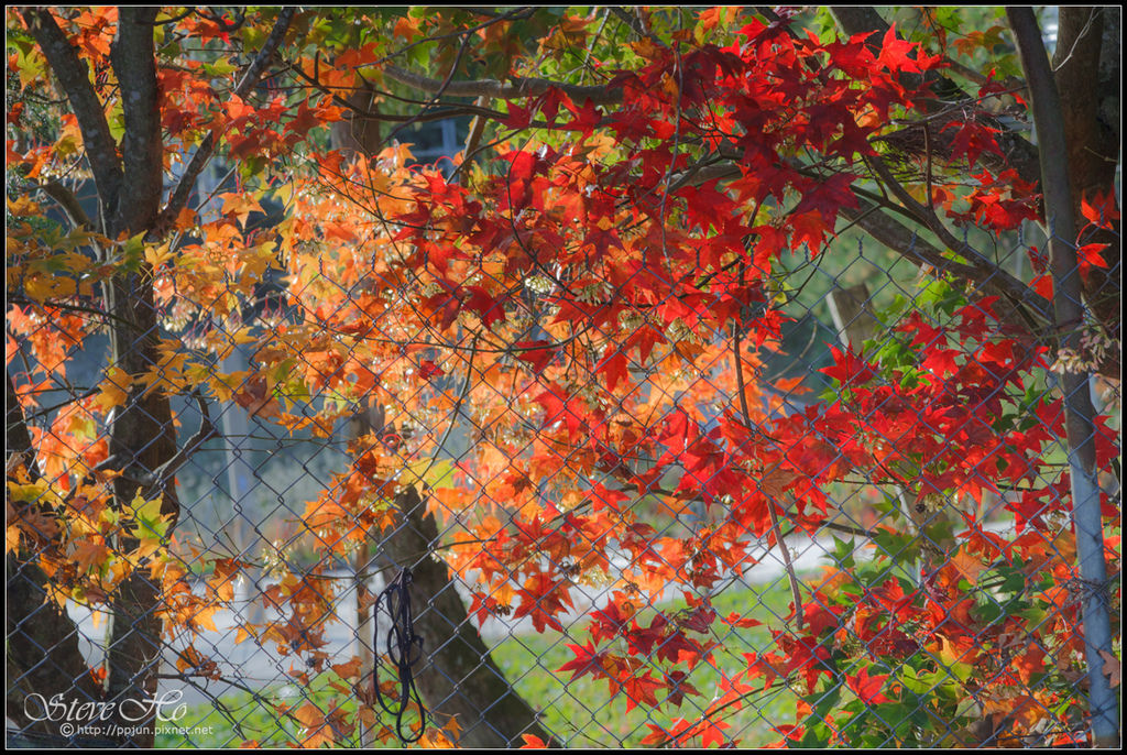▼ 門口一整片鐵絲網與楓葉交織成一幅另類的楓情