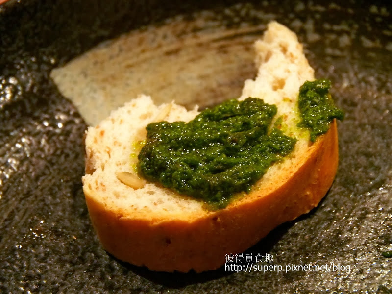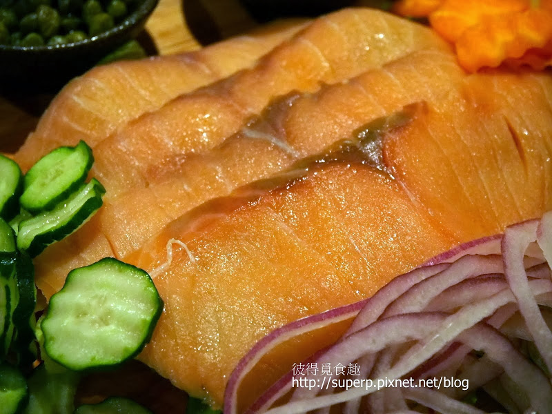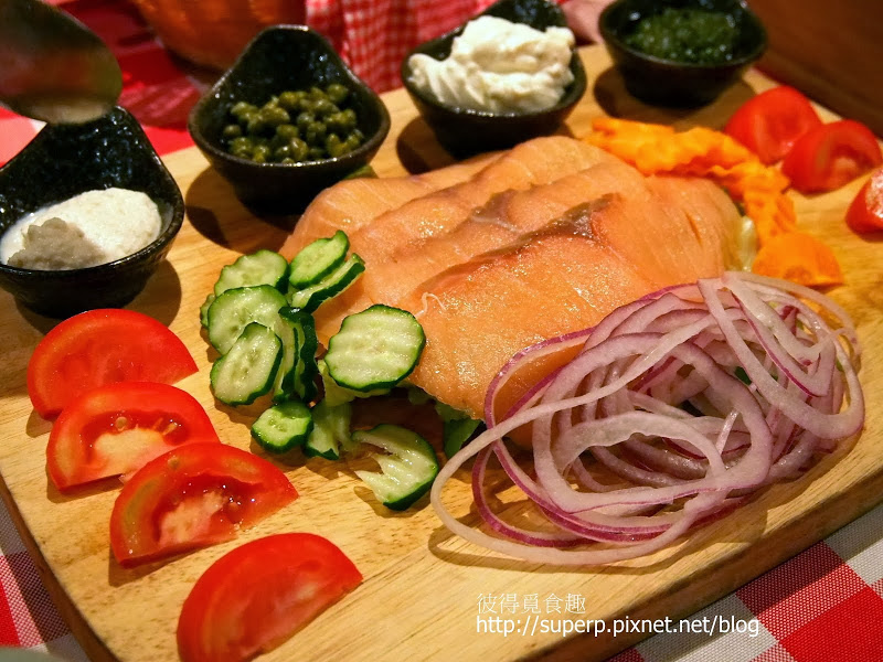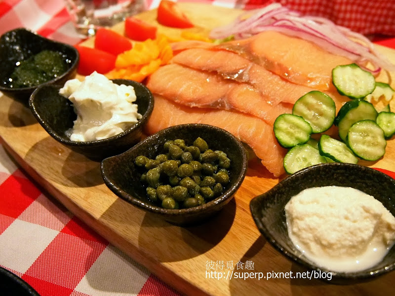 挪威煙燻鮭魚配開胃沾醬,蔬菜,洋蔥,手工德國麵包籃$460(看起來是頗澎湃的。燻鮭魚還好,各式沾醬拿來塗抹麵包頗為可口。記得有青醬的,白色的有些類似酸奶。如果喜歡這種歐式的醬料和酸豆類的應該會覺得不錯。)