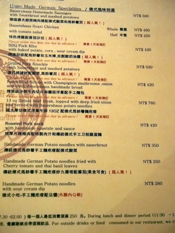 整體來說,雖然對他們的德國豬腳頗為失望,但很喜歡他們的烤牛肉和馬鈴薯麵疙瘩,而厚片豬肉刀削雞蛋麵也算不賴。這邊的食物都超適合分食的,極為豪邁。下次會想試試看他們的德式香腸和需預訂的烤雞。