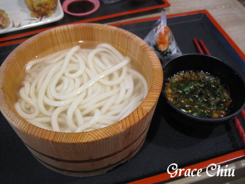 釜揚烏龍麵,這是一份沾麵餐點,用木盆裝著烏龍麵看起來很可愛,原本只有附純醬汁,照片裡的醬汁是到調味區自己加以調味的,調味區有建議可加薑末.蔥花及芝麻,我是加了蔥花.辣椒粉.芝麻以及一點碎麵衣,沾醬本身不會太鹹,加了調味就口會更添香氣.