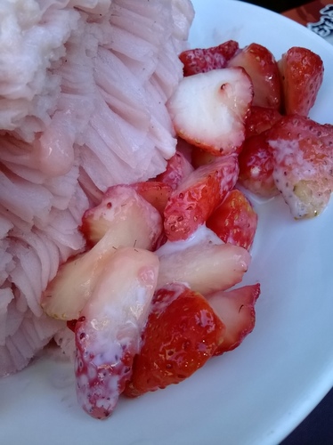其實造型很陽春,不像愛斯葵懂得創新求變,就只是把草莓和奶酪放在雪花冰上而已……