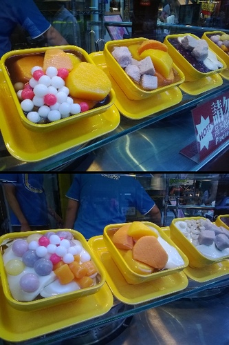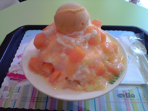 雪酪質地較稠密且較甜膩,雪花冰較硬、碎且清爽,但吃多了仍會膩(糖漿嘛:-X)