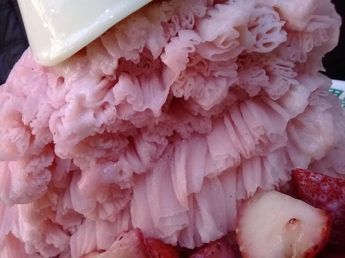 淋了幾匙的煉乳,雪花冰吃起來還蠻甜的,卻不會很奶,主要還是草莓的甜味,第一口清涼、第二口甜美、第三口濃稠,第四口就膩了