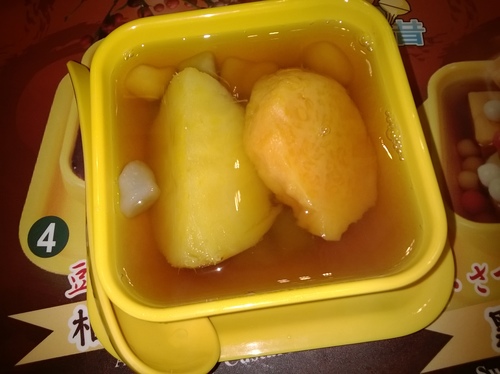 這些甜湯都很陽春,就是豆花、地瓜、芋頭、紅豆、芋圓、地瓜圓、湯圓、包心粉圓等配料作組合,也能另外加購配料,比較特別的是「椪餅」,放在甜湯裡怎麼吃呀?