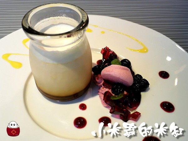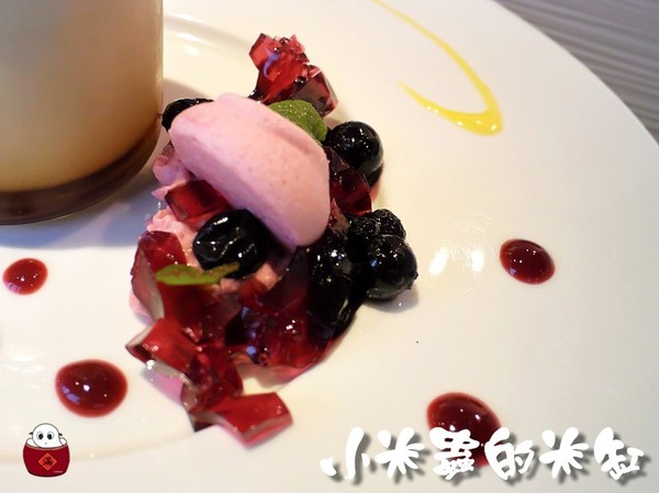 小巧的布丁瓶,旁邊搭配著色彩鮮豔的野苺慕斯