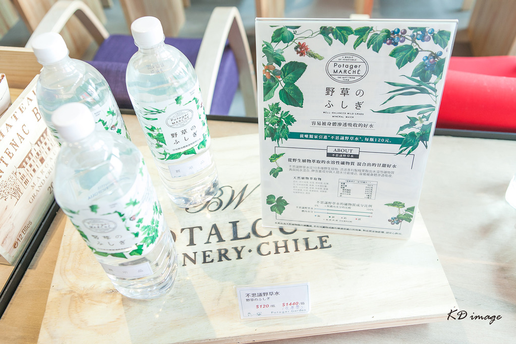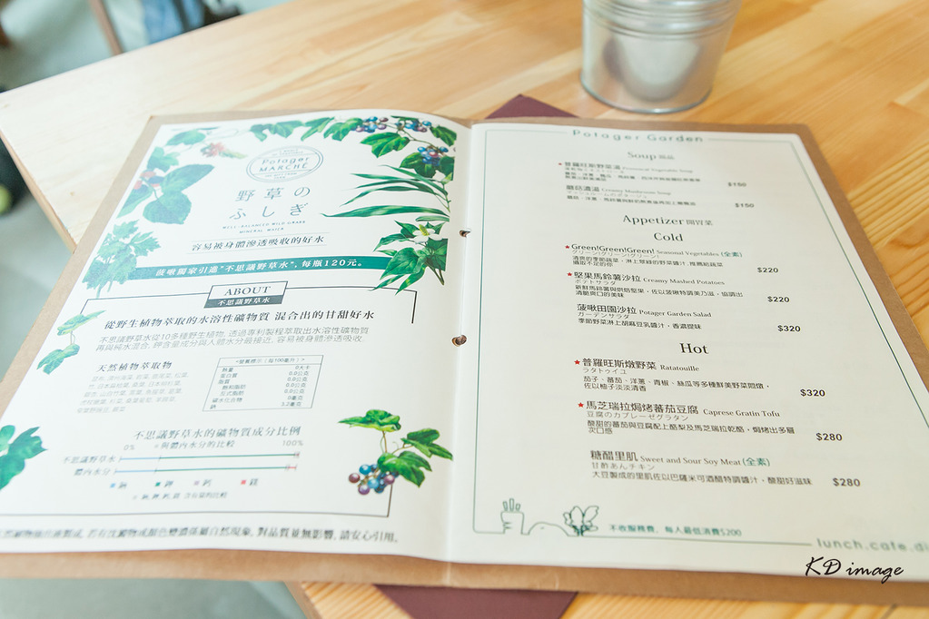 套餐分為880與580兩種價格,基本的搭配都是「湯品」、「前菜」、「主餐」、「野菜蛋糕」與簡單的咖啡、茶,差別在於選擇性的多寡,這次選擇的是880套餐。這裡沒有每桌供應開水,但可向櫃檯索取熱水,另外,或許你會想嘗試這裡相當特別的「不思議(ふしぎ)野草水」,外觀便像是一般的礦泉水,但它經由十多種天然植物裡萃取出水溶性礦物質,礦物質等相當容易被身體透吸收,不過一罐要價不斐約120元。