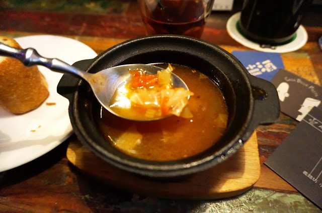 相當具有特色的鐵鍋湯碗,覺得這餐具選用的還蠻有特色的,而湯品選用以羅宋湯為搭配,整體湯品口感還蠻清爽香甜的,而麵包就十分簡單上了一塊麵包不過在口感上的酥脆度與內麵皮的鬆軟的口感是還蠻不錯的搭配,不過裝盤也可以用特色的鐵製餐具也搭配應該會很有趣