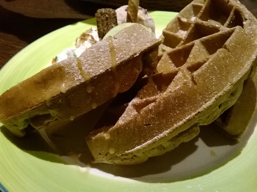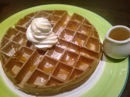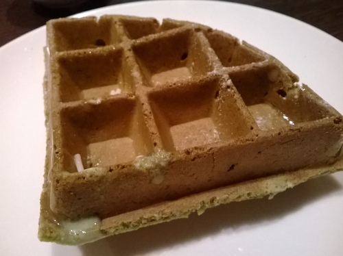 抹茶口味的鬆餅,偏薄,並不是我最尬意的厚鬆餅,上面淋了一些煉乳