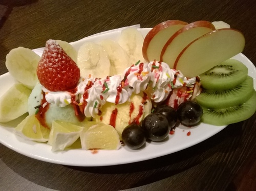 香蕉、柳丁、葡萄、奇異果、草莓、蘋果,總共六種水果,很豐富,吃起來卻很。。。(柳丁、葡萄要怎麼配冰淇淋啊?)