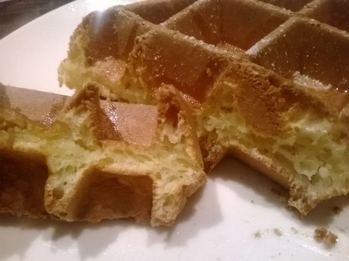 切開來隱隱約約就能看得見有白色的麻薯躲在鬆餅裡