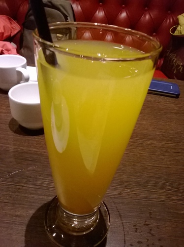 橘色的果汁好像是百香果醬直接下去稀釋,有果香,但甜得很不是滋味......
