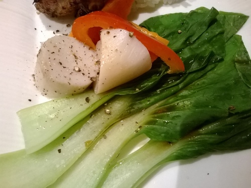 兩塊杏鮑菇很多汁、爽口,並以某種香料提味,是這盤面上唯一的佼佼者